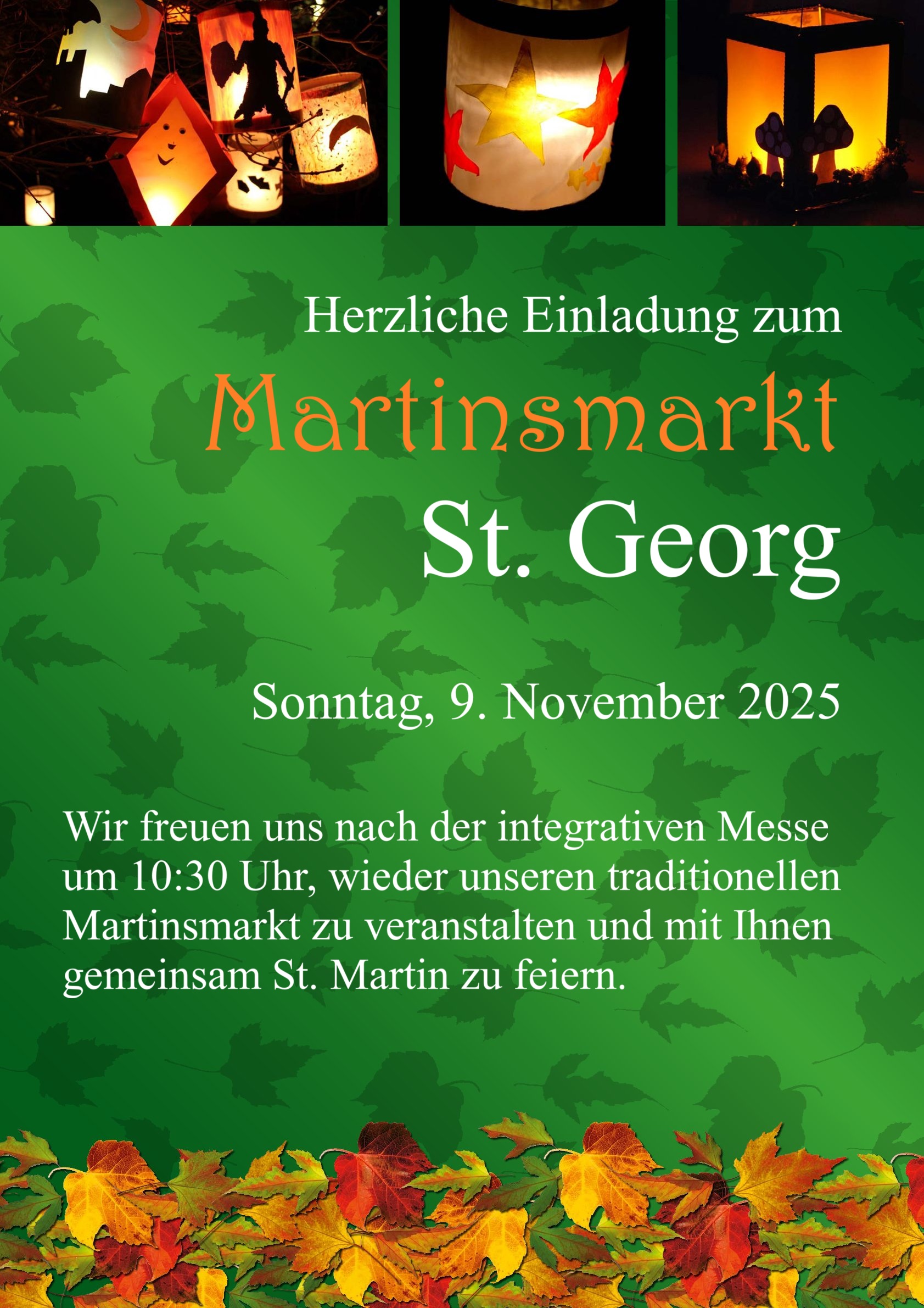 Wir freuen uns am 9. November, nach der integrativen Messe um 10.30 Uhr, wieder unseren traditionellen Martinsmarkt zu veranstalten und mit Ihnen gemeinsam St. Martin zu feiern. Die integrative Gruppe ist bereits intensiv mit der Vorbereitung beschäftigt. Sie dürfen auf viele schöne Kleinigkeiten gespannt sein. Für das leibliche Wohl wird natürlich auch gesorgt sein. Es gibt wieder Reibekuchen und Waffeln, Glühwein und Kaffee und vieles mehr! Wir freuen uns auf das Wiedersehen mit Ihnen!